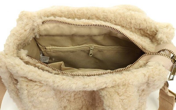 Deze volledig met zacht teddy-materiaal afgewerkte tas is een echte eyecatcher en ideaal voor koude dagen. Het grote hoofdvak biedt royaal opbergruimte en sluit af met een stevige ritssluiting, zodat je spullen altijd veilig zijn opgeborgen. Binnenin vind je drie handige kleinere vakjes, waarvan één met ritssluiting, voor het veilig opbergen van je waardevolle items. Verder heeft de tas een lange verstelbare band.