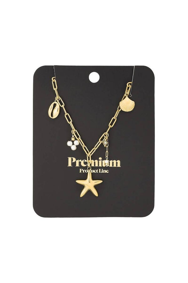 Laat je betoveren door de charme van de ketting. De verfijne schakels zijn versierd met speelse bedels zoals een glanzende zeester, schelpjes, pareltjes. perfect om jouw zomerlookje compleet te maken.
