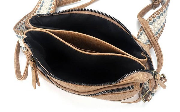 De tas valt gelijk op dankzij de royale vakken die afgesloten worden met een rits. Deze drie vakken zijn allen geschikt voor verschillende telefoons of andere waardevolle spullen. Tussen deze twee royale vakken, bevinden zich verschillende insteekvakjes voor pasjes. Aan de achterkant zit een vakje afsluitbaar met rits.