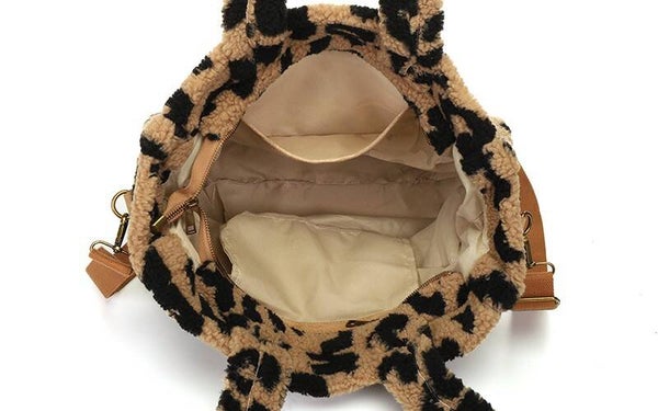 Deze volledig met zacht teddy-materiaal afgewerkte tas is een echte eyecatcher met zijn panter print en ideaal voor koude dagen. Het grote hoofdvak biedt royaal opbergruimte en sluit af met een stevige ritssluiting, zodat je spullen altijd veilig zijn opgeborgen. Binnenin vind je twee handige kleinere vakjes, waarvan ??n met ritssluiting, voor het veilig opbergen van je waardevolle items.
